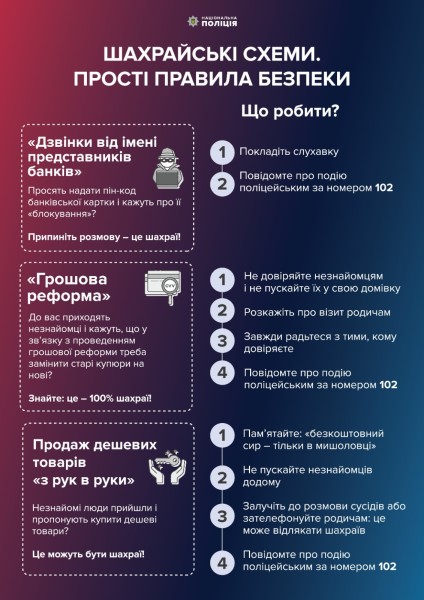 Шановні громадяни! Ваша особиста обачливість та уважність допоможуть зберегти грошові кошти і не потрапити у ситуацію, яка умисно створена аферистами для заволодіння заощадженнями.