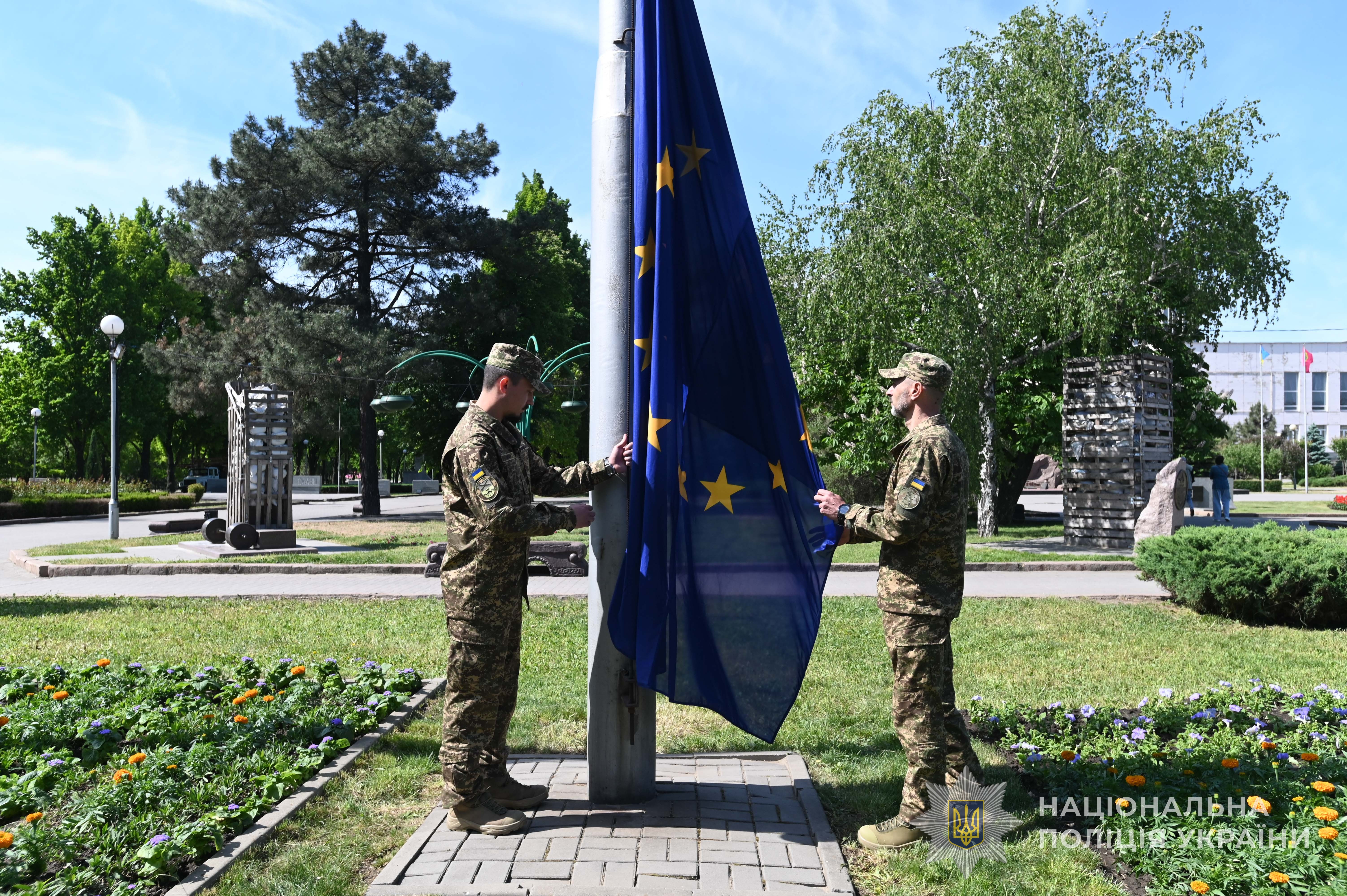 До знаменної дати та на знак єдності з європейським світом у Запоріжжі підняли прапор Євросоюзу. В урочистому заході взяли участь заступник начальника ГУНП в Запорізькій області Юрій Небеський, керівники обласної та міської влади, правоохоронці, рятувальники, військові, а також жителі та гості міста.