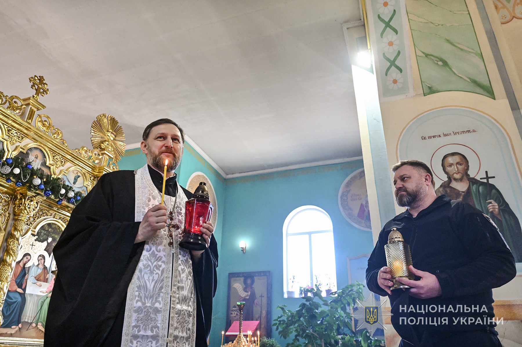 «Сьогодні, напередодні Різдва Христового, привезли вам із Кафедрального собору Святої Трійці Вифлеємський вогонь. Щоб, зустрічаючи Різдво не вдома, далеко від найдорожчих вам людей, ви пройнялися теплом та надією на перемогу світла над темрявою», - звернувся до поліцейських Павло Карабута.