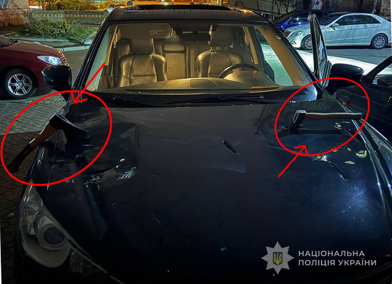 У той час, коли жінка перебувала в кав’ярні, зловмисники порубали кузов її машини заздалегідь придбаними сокирами. Знаряддя злочину залишили стирчати в капоті, а самі втекли.