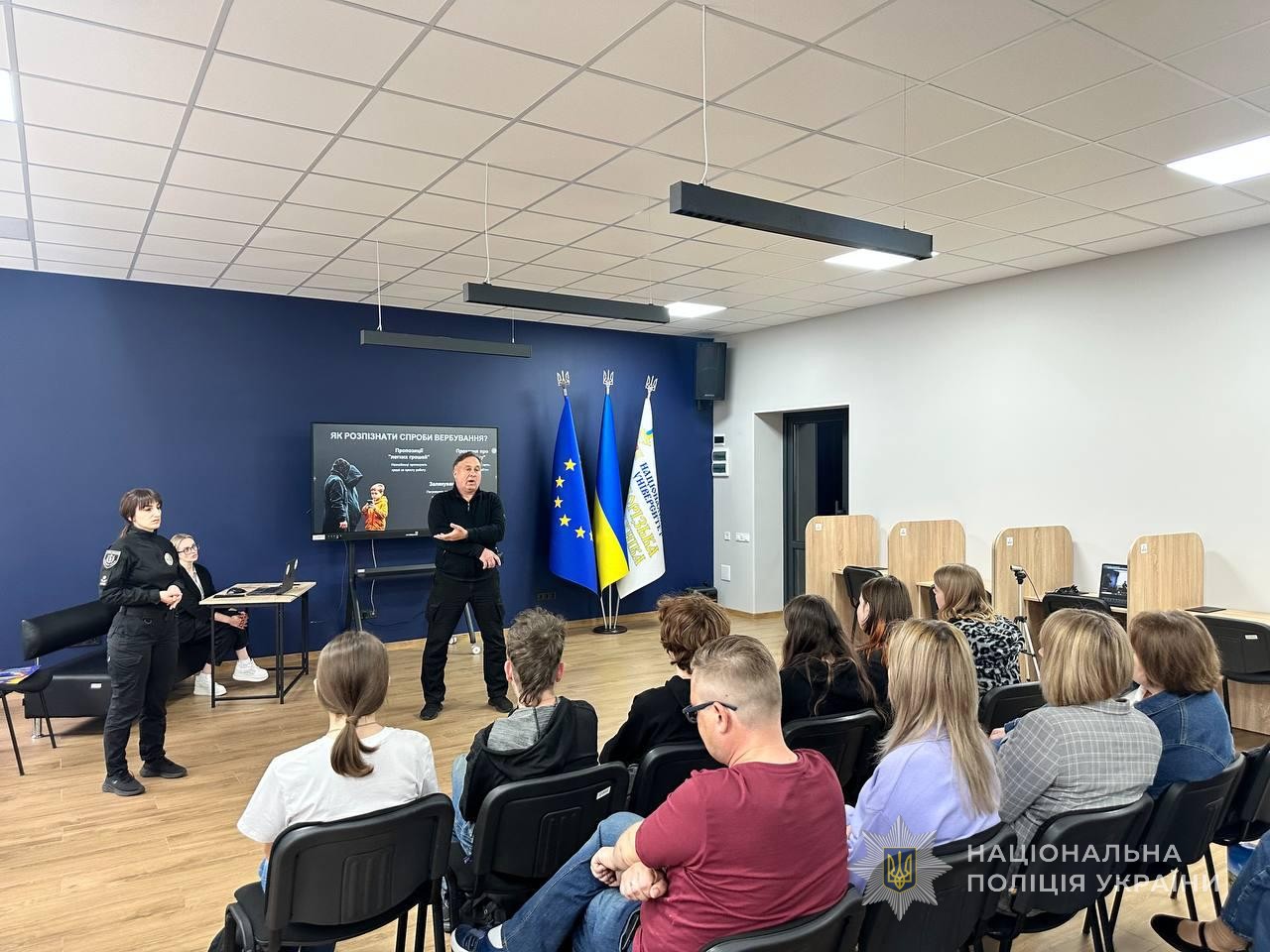 Під час лекцій ювенальні поліцейські роз’яснюють учасникам, як не стати жертвою маніпуляцій, які використовують російські злочинні угруповання для залучення молодих людей до протиправної діяльності.