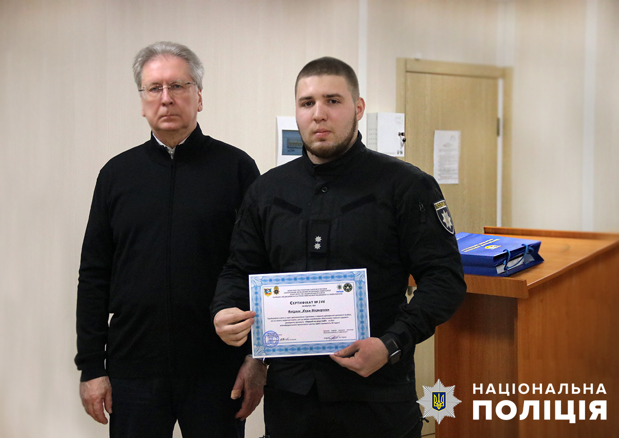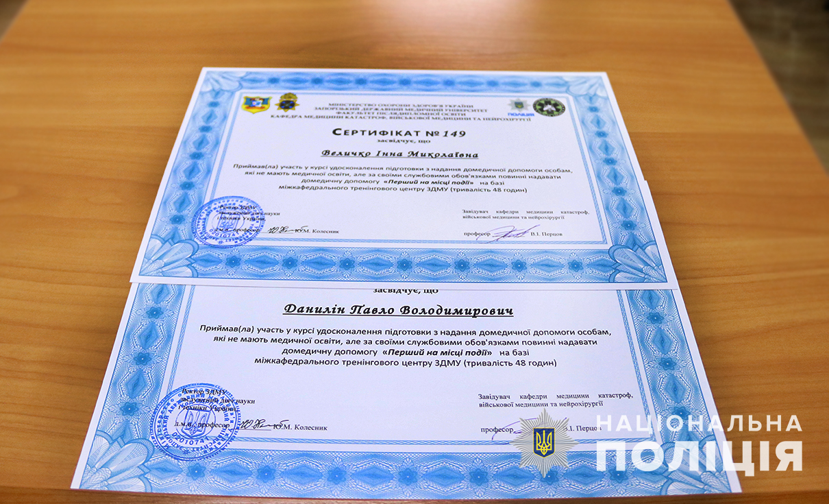 Учора, 3 січня, на базі Запорізького державного медичного університету відбулось урочисте вручення сертифікатів працівникам поліції, які пройшли курс удосконалення підготовки з надання домедичної допомоги «Перший на місці події». У заході взяли участь начальник обласного главку поліції Артем Кисько, ректор ЗДМУ Юрій Колесник та випускники курсу.