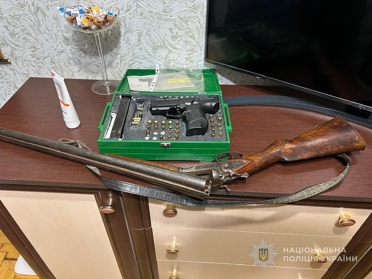 За місцем мешкання фігуранта працівники поліції провели обшук та виявили стартовий пістолет (попередньо - з ознаками переробки), мисливську рушницю, 44 патрони травматичної дії калібру 9 мм, а також речовину рослинного походження (попередньо – канабіс).