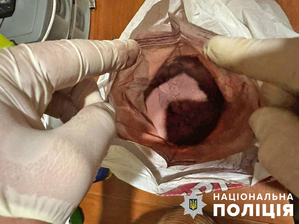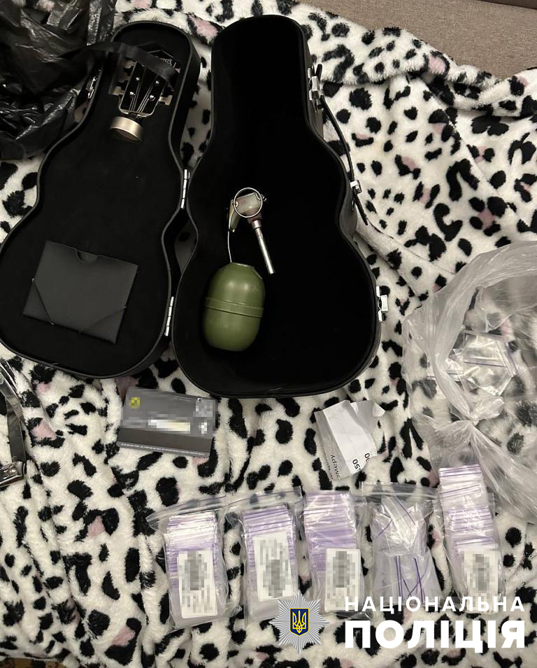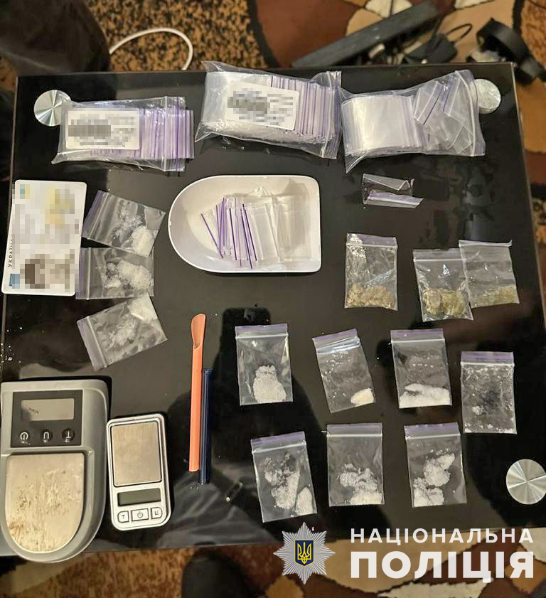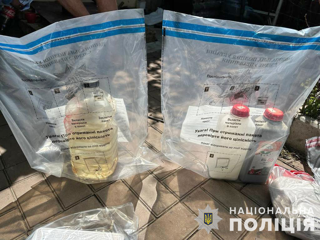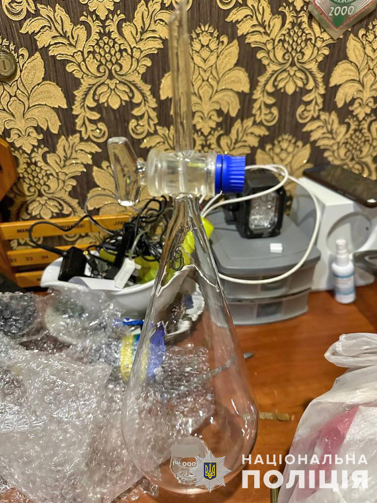 За результатами слідчих дій правоохоронці виявили і вилучили 11 зіп-пакетів з порошкоподібною речовиною білого кольору (попередньо метамфетамін), 3 зіп-пакети з речовиною рослинного походження (попередньо марихуана), 2 електронних вагів, корпус гранати з підривачем, 2 набої калібрами 9 та 5,45мм, 1 пакет з порошкоподібною речовиною червоного кольору, вагою близько 1 кг (попередньо прекурсор - червоний фосфор), 3 полімерні ємності з рідинами із специфічним запахом, блокнот із чорновими записами та мобільний телефон.