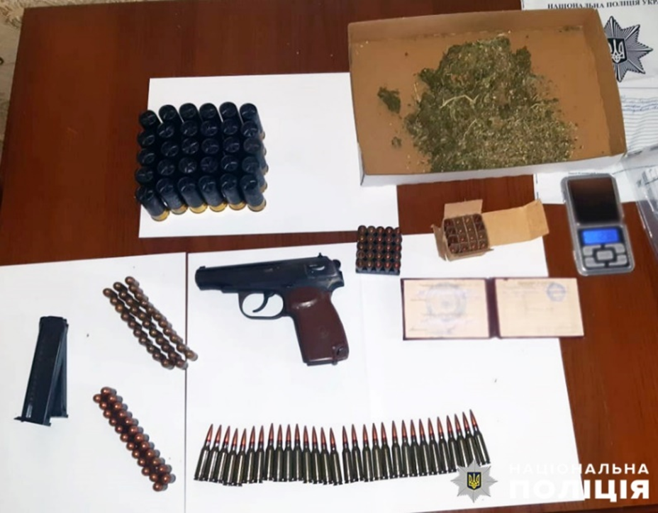 Під час обшукових заходів правоохоронці виявили та вилучили у фігуранта предмет пістолет із двома магазинами, понад 150 патронів різних калібрів та близько 130 грамів речовини рослинного походження (попередньо - канабіс елітних сортів «шишки»).
