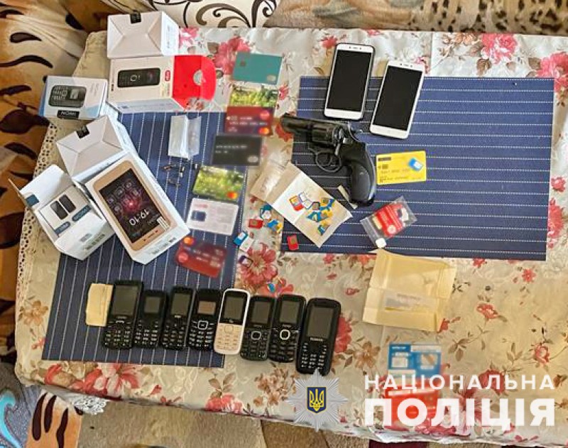 Правоохоронці провели обшук за місцем мешкання фігуранта. За його результатами поліцейські виявили та вилучили 9 мобільних телефонів, 7 банківських карток, 32 сім-карти та 4 слоти до них, а також револьвер для відстрілу набоїв Флобер.