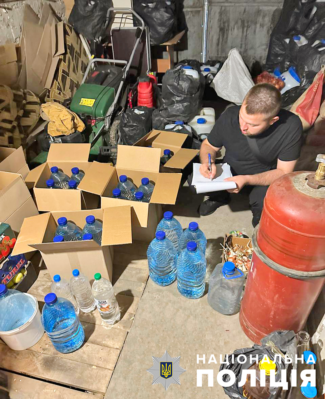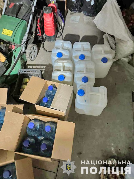 У результаті проведених заходів працівники поліції виявили та вилучили 309 літрів спиртовмісної рідини невідомого походження у полімерних пляшках.