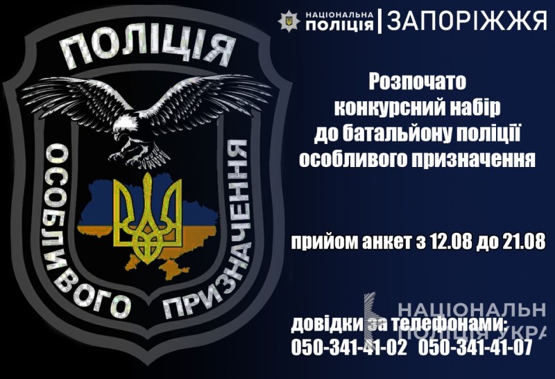 З 12 серпня Головне управління поліції в Запорізькій області запрошує бажаючих до участі в конкурсі на заміщення 12 вакантних посад молодшого складу поліції в підрозділі поліції особливого призначення.